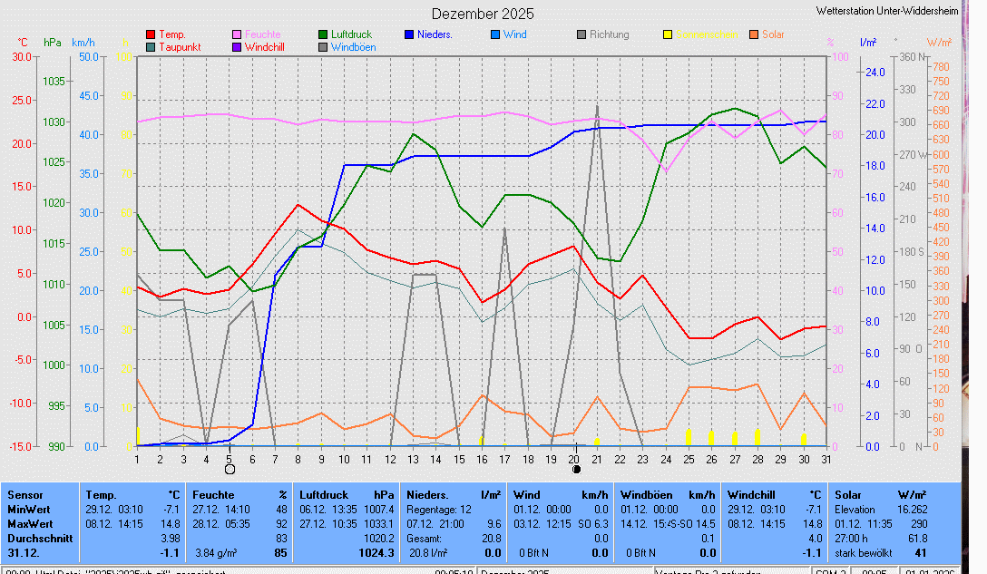 | Niederschlag | letzte Std. | 0,0 l/m² | ||||||